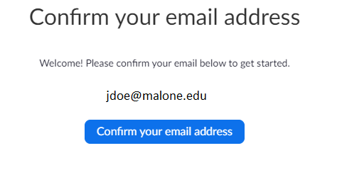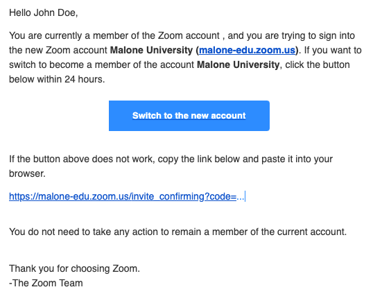 Click “confirm your email address” button and then check your inbox for an invitation email to Malone Zoom. You will receive an email that looks like the one below. Next, click the “Switch to the new account” link and then follow the instructions to complete the change (just clicking through a few things). This will migrate the existing Zoom account and attach it to your university account. Once finished, you will be able to login to your Malone Zoom account. See example below: Possible Errors: Some users with a personal Zoom account tied to their Malone email may see the error message below instead of the email confirmation screen. If you see a message like the one below when attempting to sign in to Malone Zoom, then you will need to contact the Malone Help Desk and ask them to send you an email invite to Zoom. Once you receive the email, click on the link in the email and follow the instructions to convert your personal Zoom account to an organization account.